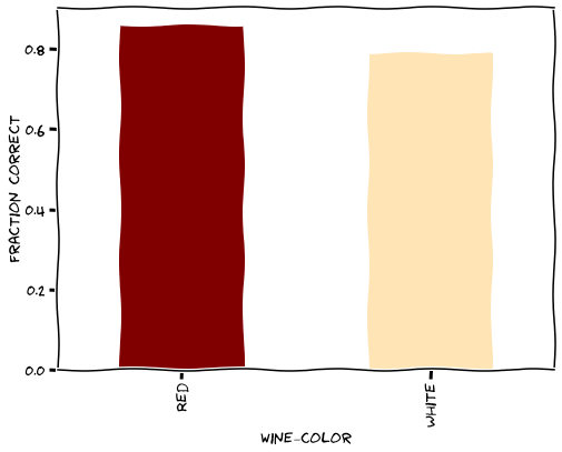 Broken down by type, guessers correctly identified red wine 85.5% of the time, and white wine 78.9% of the time.